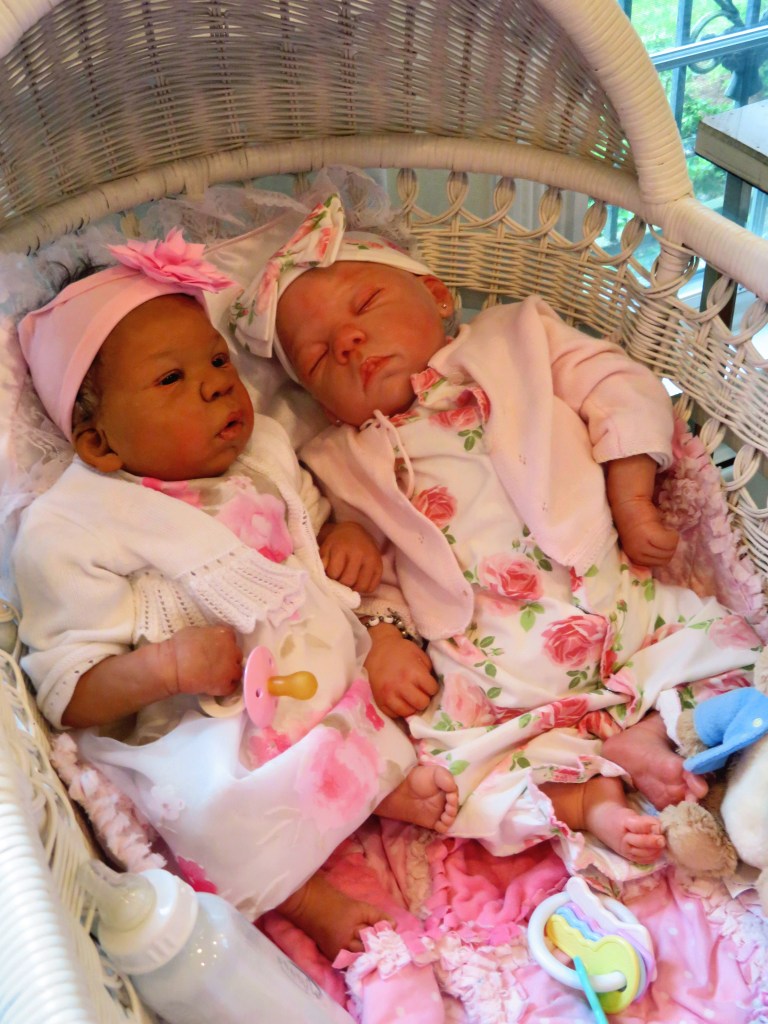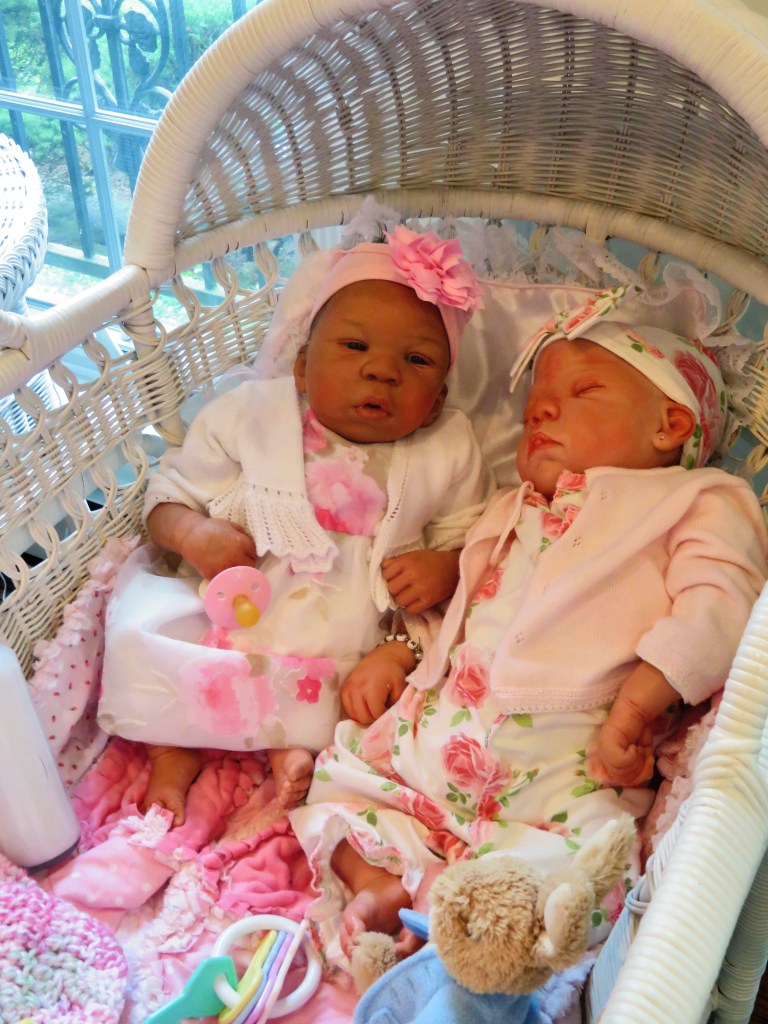 Here are two OOAK polymer clay art doll babies by Lorna Miller Sands. Lorna makes her babies life-sized and they feel like a real baby when you hold them. They are displayed in a full-sized wicker bassinet and wear real boutique infant clothing.