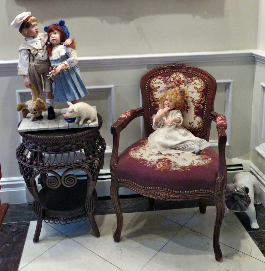 All these dolls are OOAK and sculpted from polymer clay. The artist is my friend Ode Segui. The needlepoint chair is an antique childs chair and the wicker table is a reproduction. The ceramic pug is from Italy. They are in the hallway of our house near the doll-miniature room.