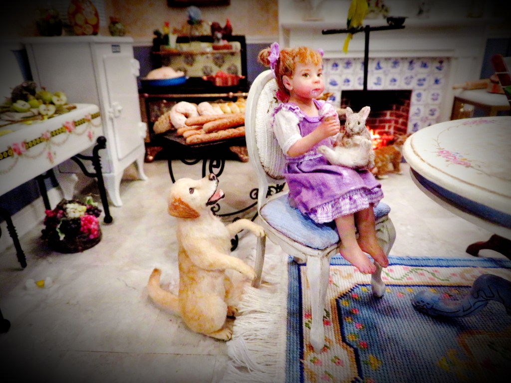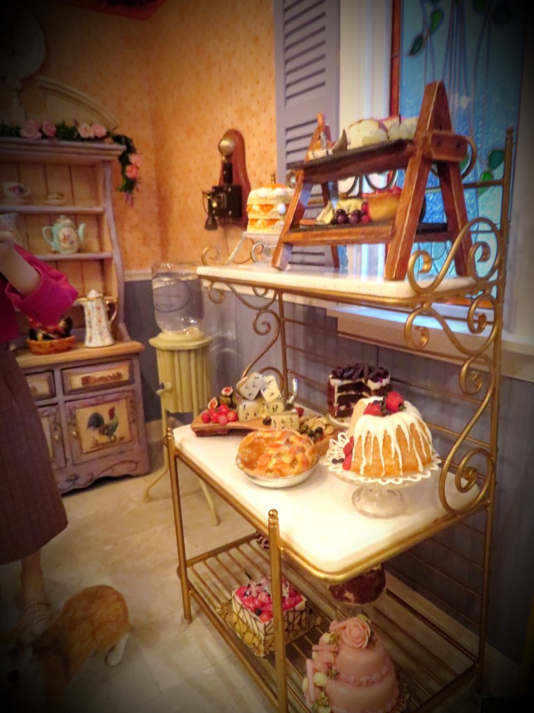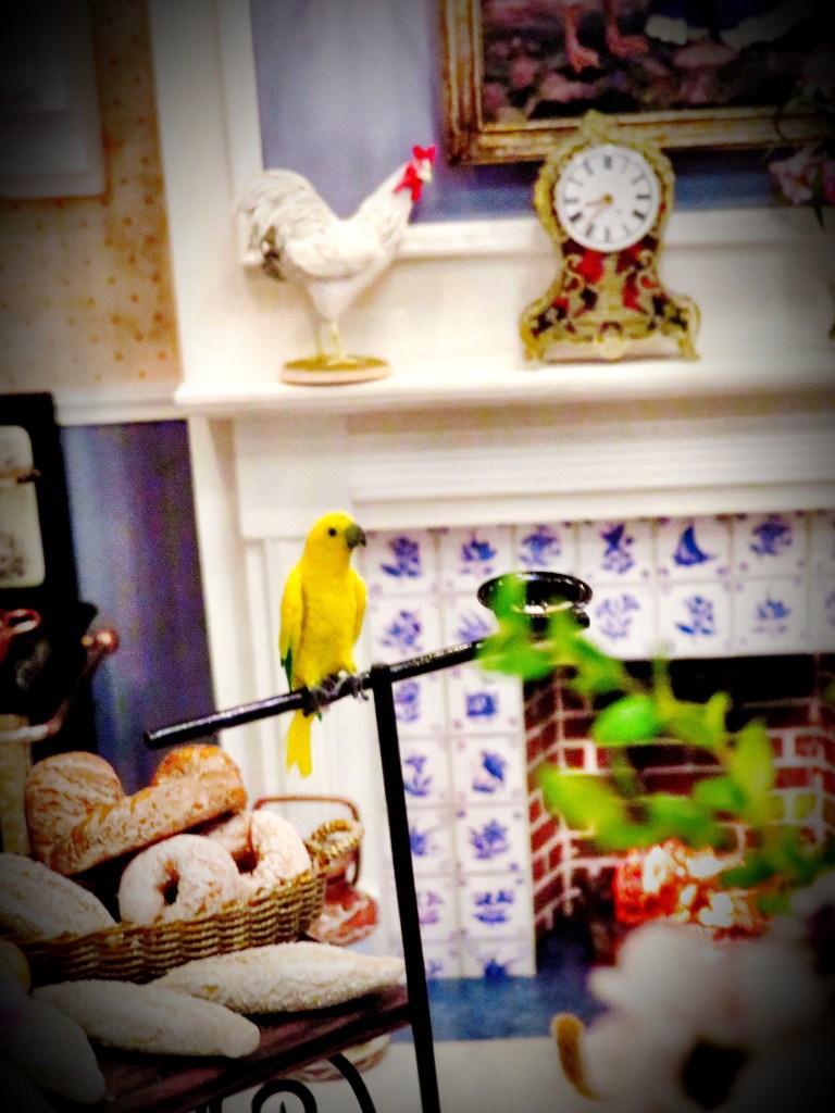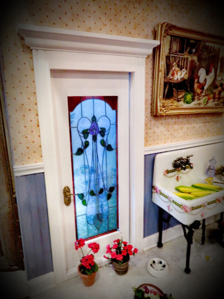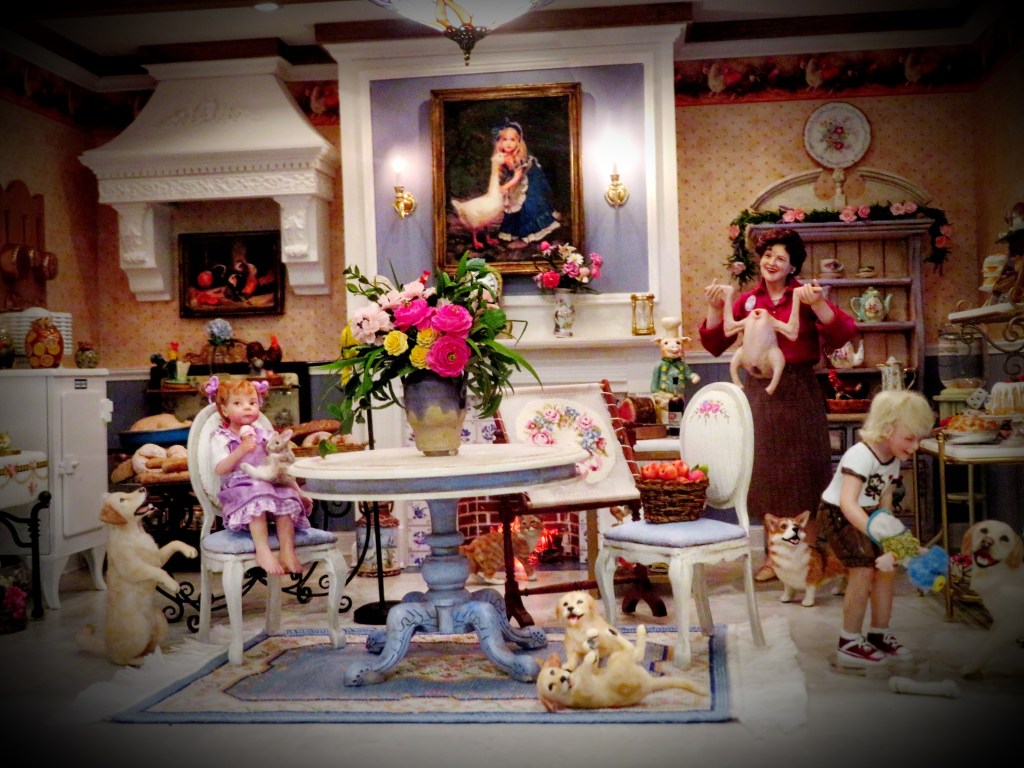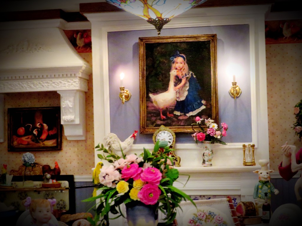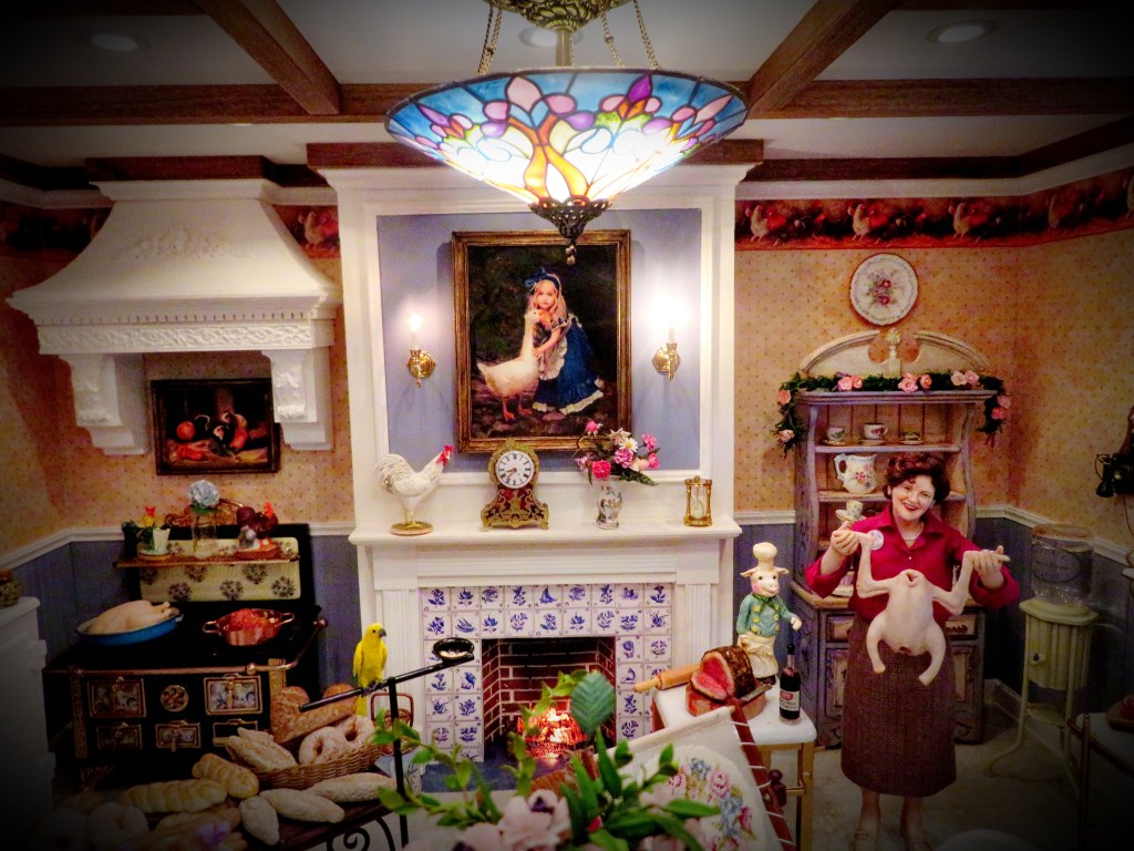 The stained glass door, window, and celling fixture are by Barbara Sabia. Paintings are by Michael Reynolds and Christopher Sparrow. Jason Getzan, Nicola Mascall, Valeria, Sandra Rubin, Crown Jewel Miniatures, the English Kitchen, and Kiva Atkinson, all contributed to the room. Helen Archoleka made the table and chairs and the flower trimmed hutch. If you try you can smell the goose cooking!