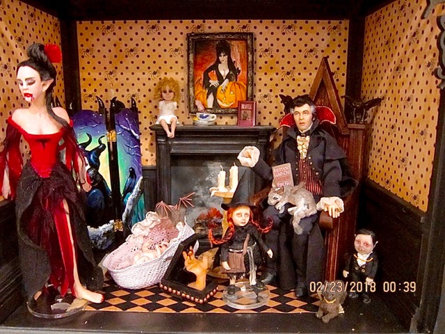 Years ago I watched a young Frank Langella play Count Dracula on Broadway. His performance blew me away. I commissioned my friend Sharon Cariola to make me Frank Langella as the Count. She also supplied the chair he sits in. Cyndi Cannon took one of her dolls and turned it into a female vampire dripping blood!