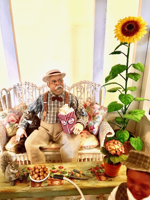Inside the gazebo is a fanciful Victorian sofa with floral upholstery and throw pillows. Famed late actor Wilfred Brimley was copied in 1:12 scale by Sharon Cariola. He is eating popcorn and relaxing. The tall sunflower was made by Deb Ann. It is amazingly realistic. Michal Gvir made the grey chubby squirrel and the detailed chestnuts and nutcracker are from Italy. I used a hand painted vintage bench as a table. The late Karen Markland made that decades ago. There’s a lot more to see in the gazebo-this is a taste of more to come.